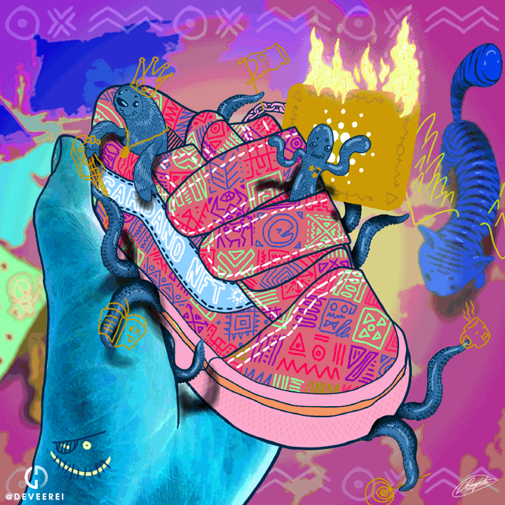 This is the Cardano Africa NFT.The piece basically says that Africa is just a small step for Cardano, and that more can be achieved. Kinda like when Armstrong said, “That's one small step for man, one giant leap for mankind.”. So, this small step Cardano is making can become a giant leap for this blockchain, that can maybe conquer the whole world.The creatures I added may be related to NFTs, where everything can be unique and amazing. The shoe itself has been designed with NFT-inspired and african-inspired prints.
